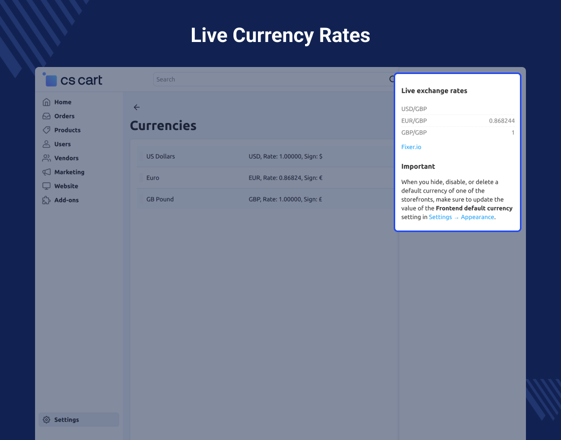 By eliminating manual rate updates and ensuring transparent pricing, it helps build customer trust and supports global sales. The add-on is easy to configure, works seamlessly with CS-Cart and CS-Cart Multi-Vendor, and gives admins full control over currency sources and settings without added complexity.
