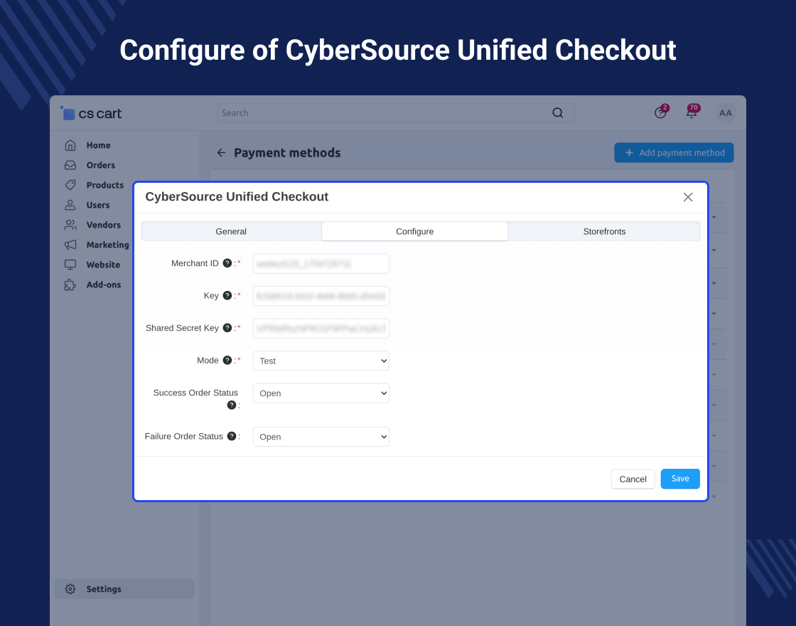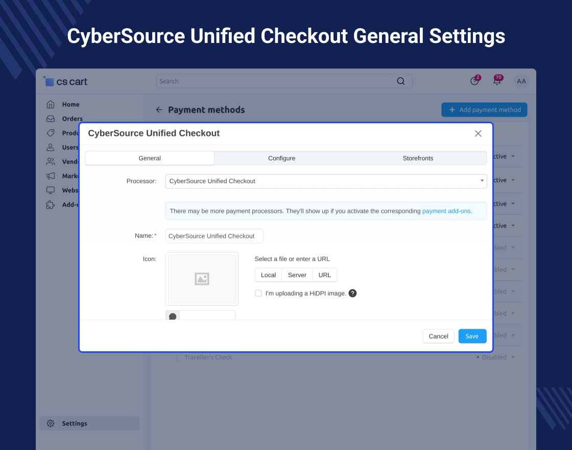 CS-Cart CyberSource payment gateway enables you to accept payments securely, without involving the risks in handling payment data. At the same time, this solution enables you to deliver seamless payment experiences to consumers.