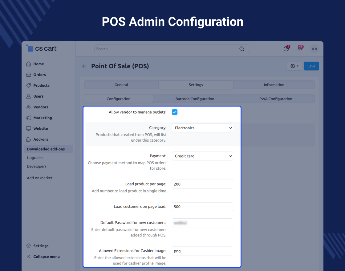 - Manage multiple POS outlets from one CS-Cart admin panel.