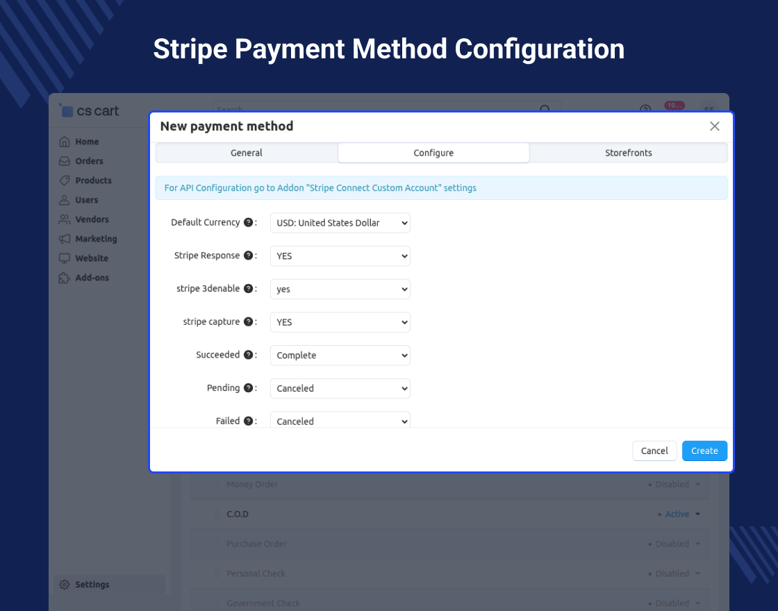 CS-Cart Stripe Connect Custom is the add-on that allows you to integrate with Stripe Connect, a payment processing service that allows you to accept payments from customers and pay out to vendors or sellers on your platform.
