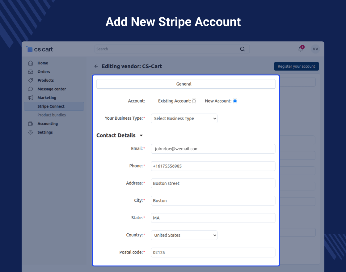 As a result, the CS-Cart website can communicate with both standalone and custom Stripe accounts. CS-Cart platform should be linked to the Stripe custom account to receive customer payments. The admin will manage each interaction with his users.