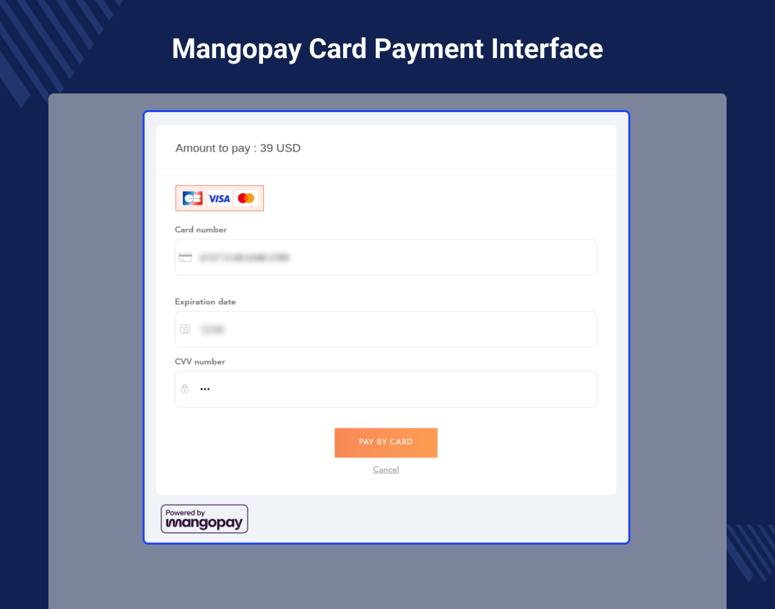 The module allows buyers to make payment using cards Carte Bleue (CB), Visa, Mastercard, Maestro and Diners(currency allow as per Mangopay) and Direct Debit.