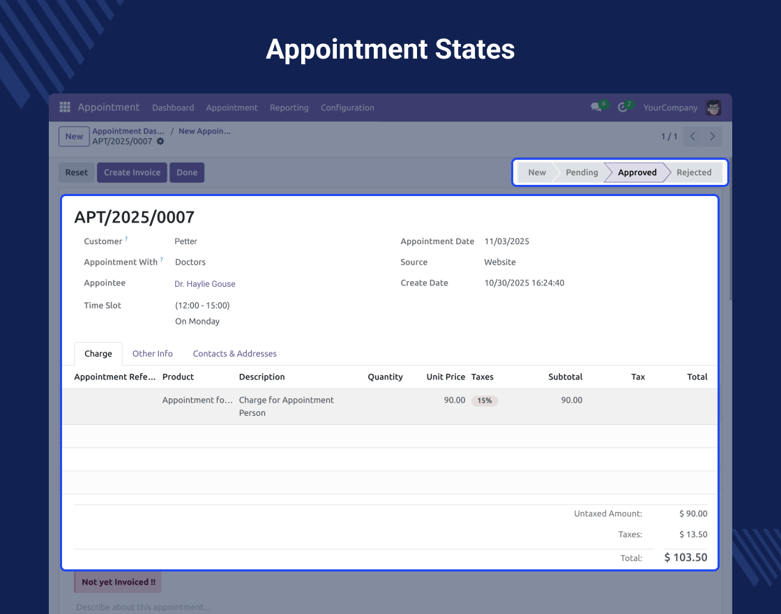 Odoo Appointment Management System offers an easy calendar that helps you plan your day and book appointments with a single click. It also lets you create and assign timeslots easily without moving through the same process again.