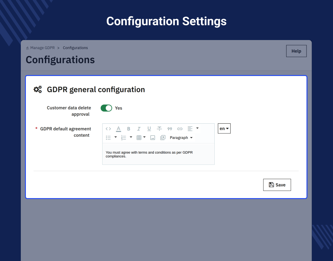 - Enable/disable the auto-approval of personal data deletion of the customers.
