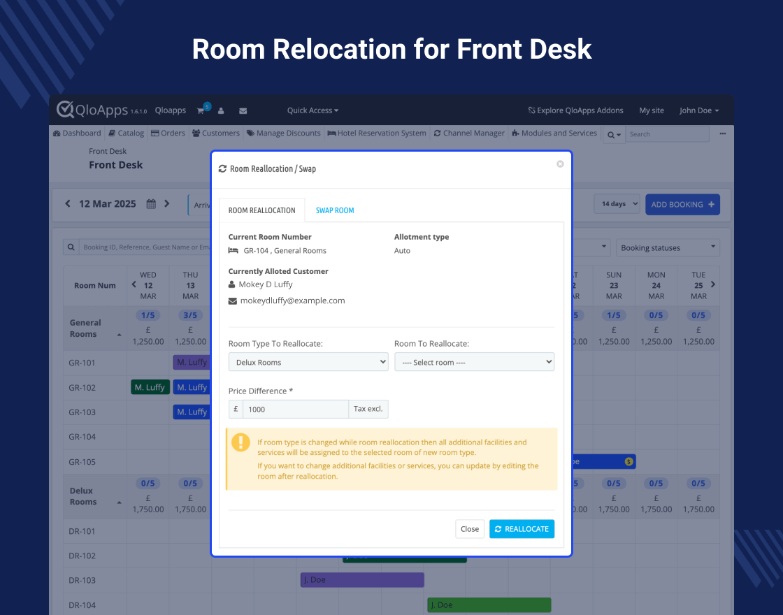 QloApps Front Desk System is an advanced hotel management add-on that enhances your front desk operations with an intuitive calendar-based interface. This upgrade simplifies reservation management, allowing you to create, edit, and modify bookings seamlessly.