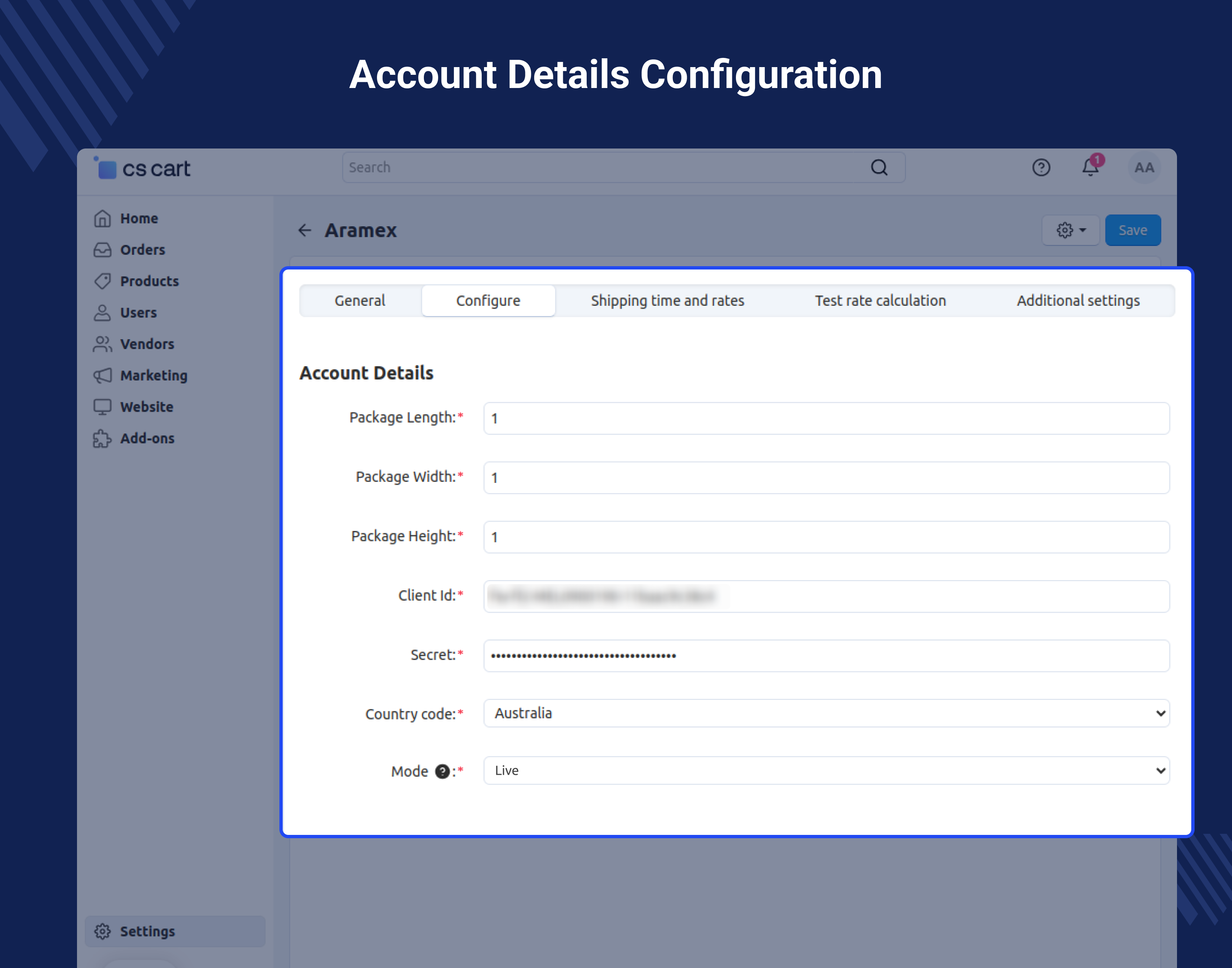 Set up dimensional and account configurations to link your CS-Cart store with Aramex.
