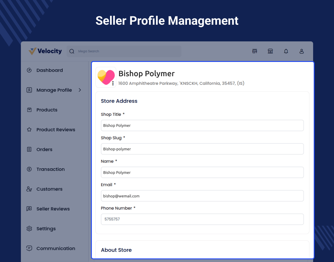 - Interactive view for seller profile and easy to upload seller logo and banner with colors.