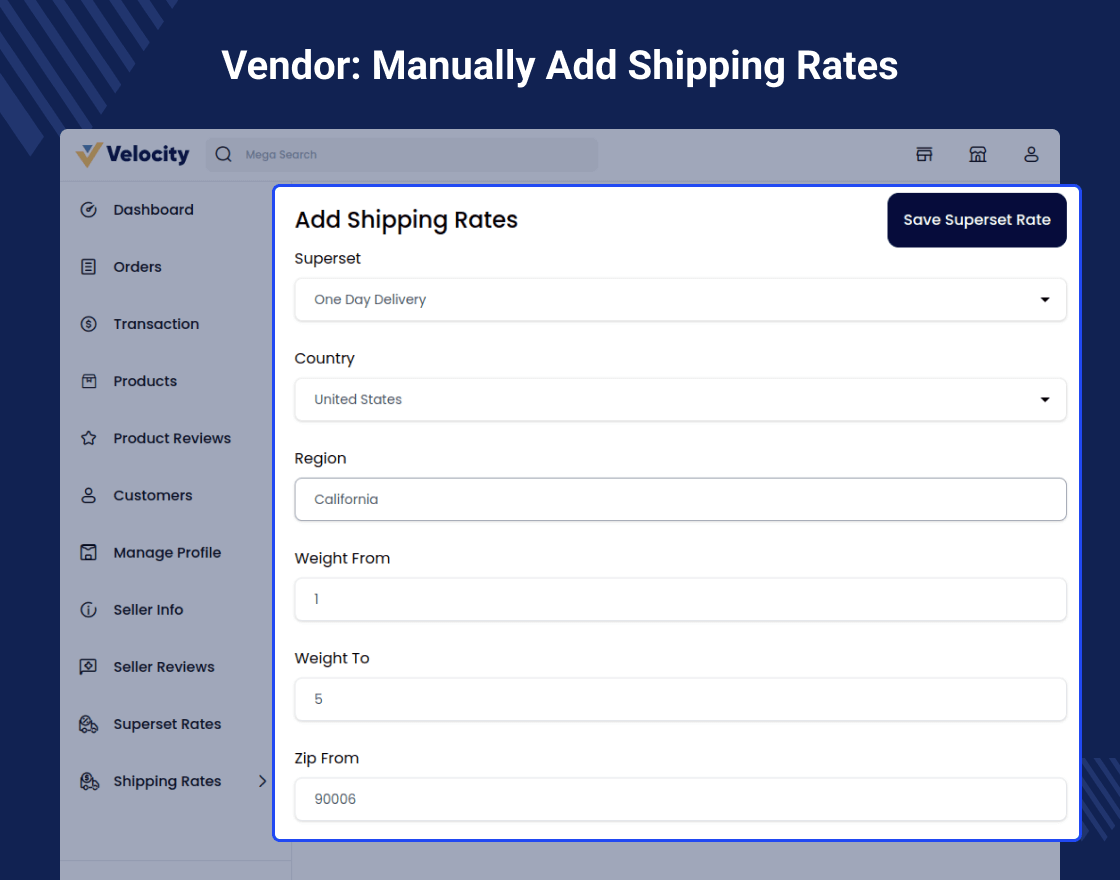 This module allows the seller to set custom superset rates and shipping rates from their dashboard. In this module, shipping will be calculated based on ZIP and the weight of the product.