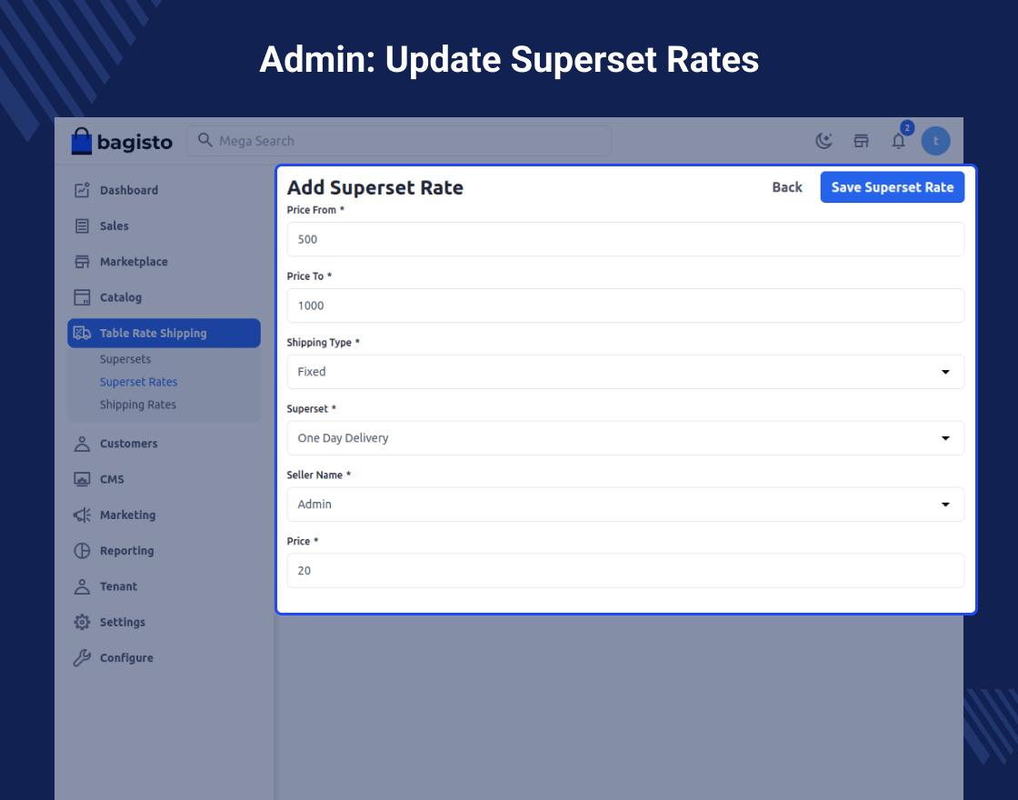 - The sellers can set custom superset rates and shipping rates from their dashboard.