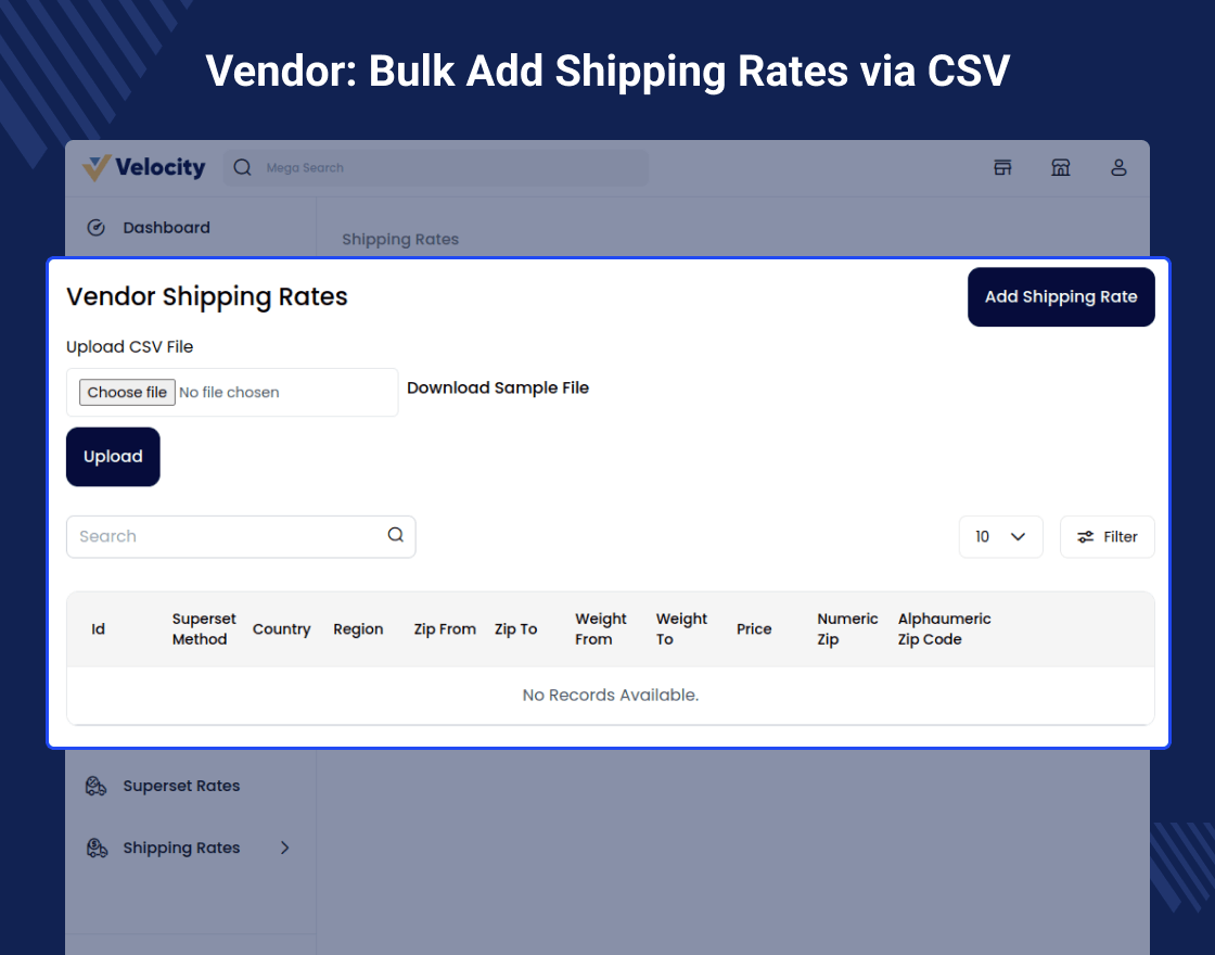 The tenant and seller can add the shipping rates by uploading the CSV file.