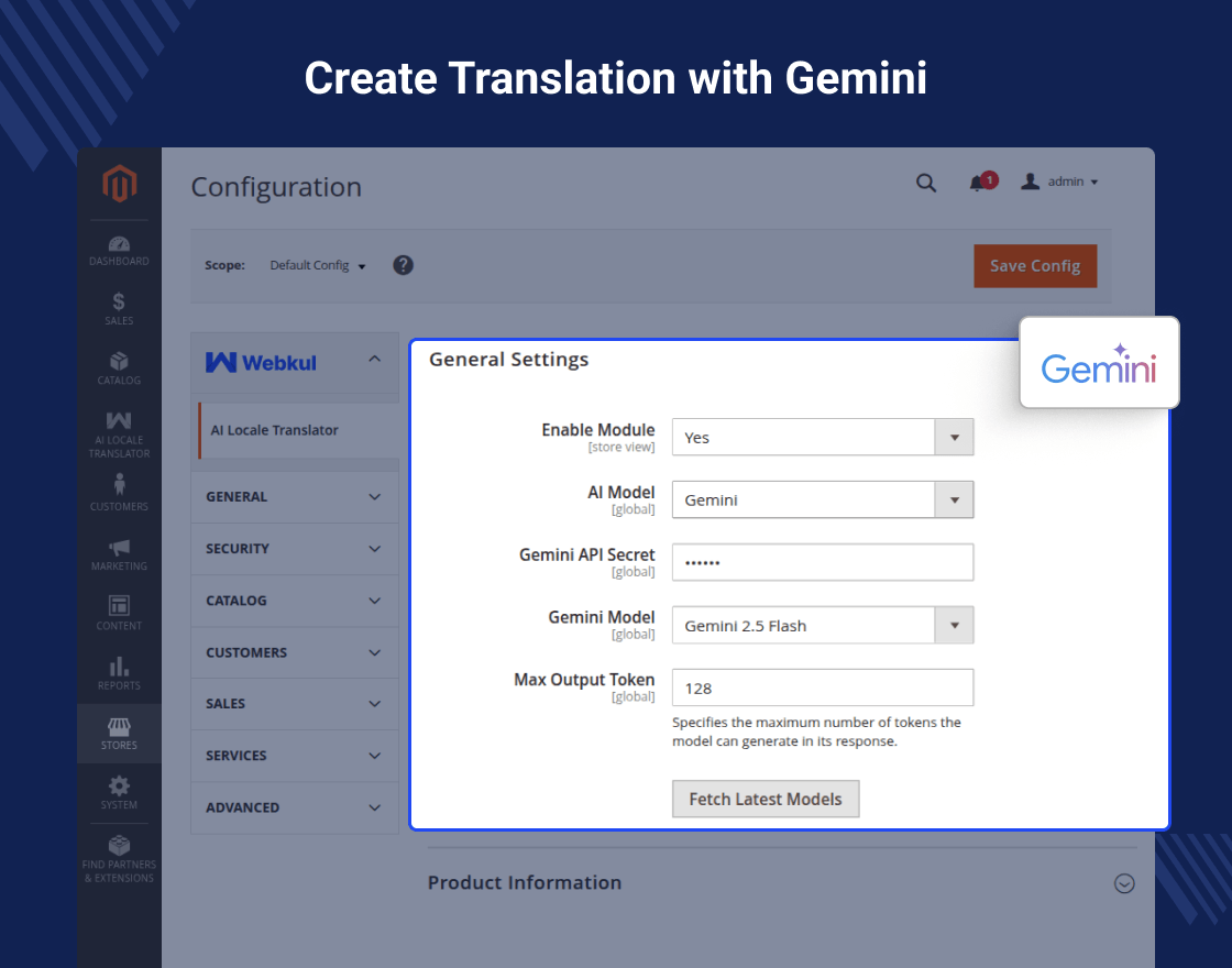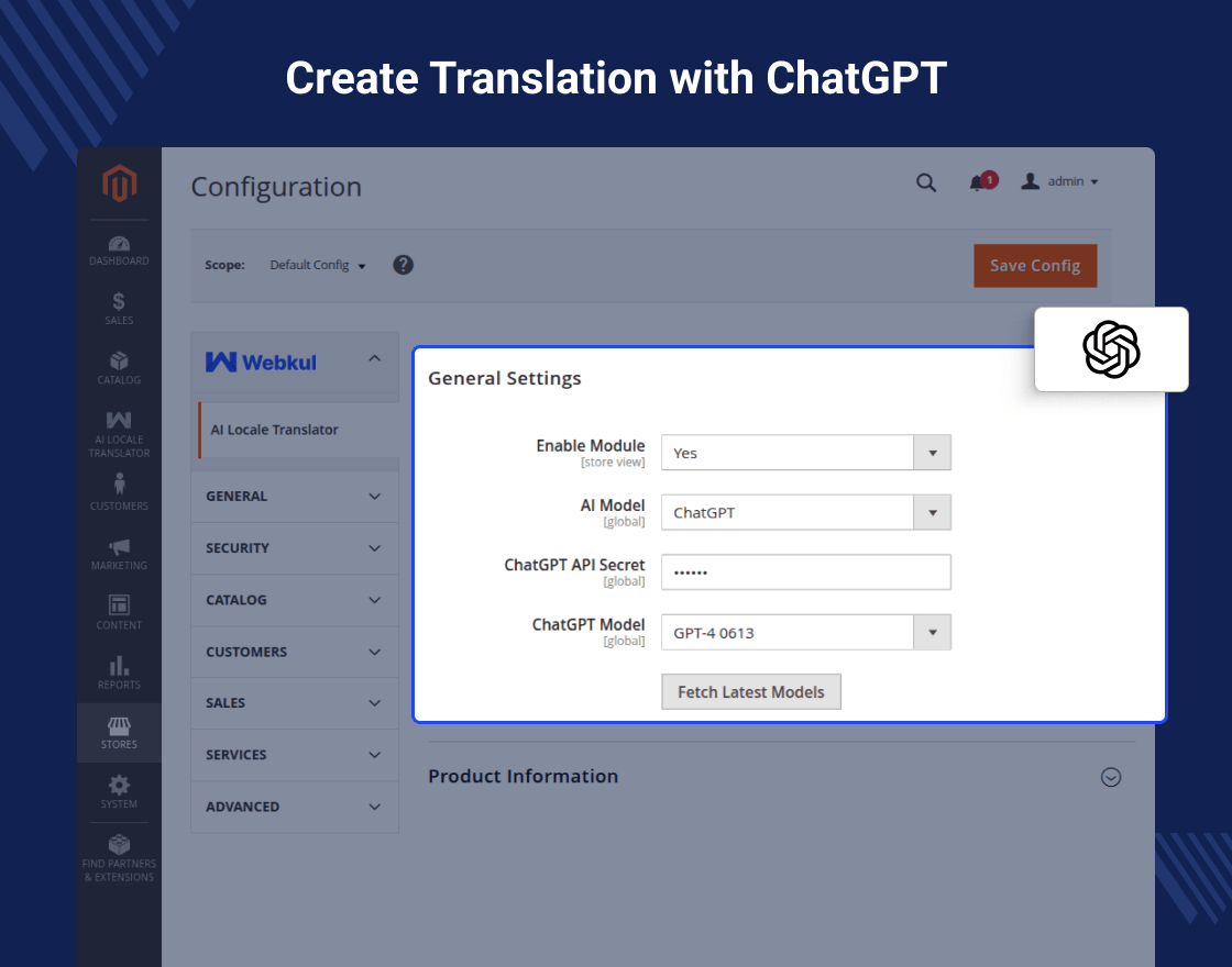 After installing Magento 2 AI Locale Translator, the admin can configure the module and set up the required API model.