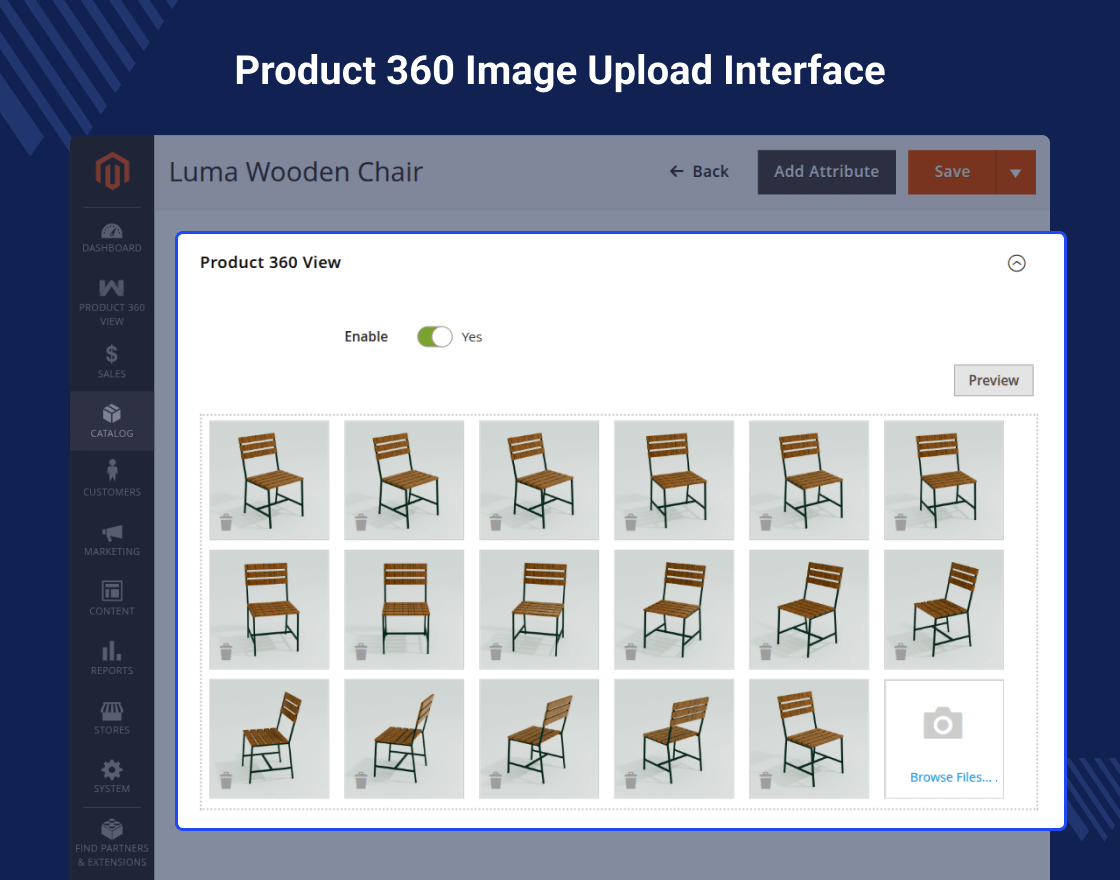 - The admin can preview the product 360 views, before saving the product and can manage the images accordingly.