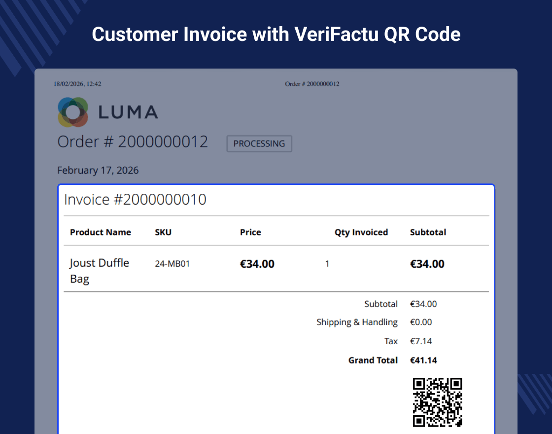 Magento 2 connects with Spain’s official VeriFactu system. As a result, invoice data is checked in real time.