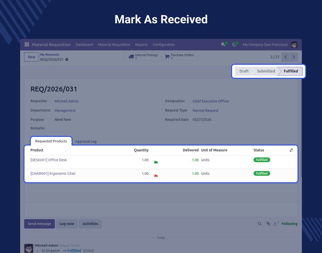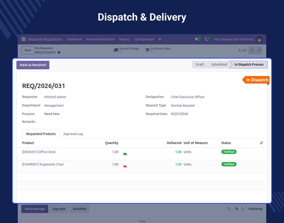 In Odoo Material Requisition and Approval, once items are delivered, users confirm receipt. The system then closes the request.