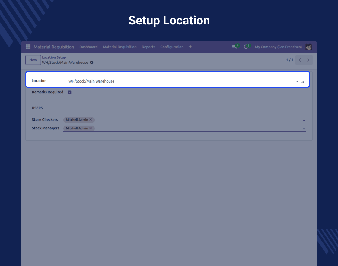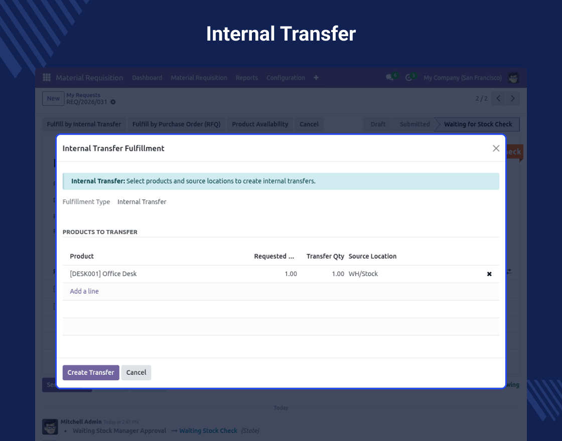 Odoo Material Requisition and Approval helps users create requests by adding products, quantity, and location in a simple way.