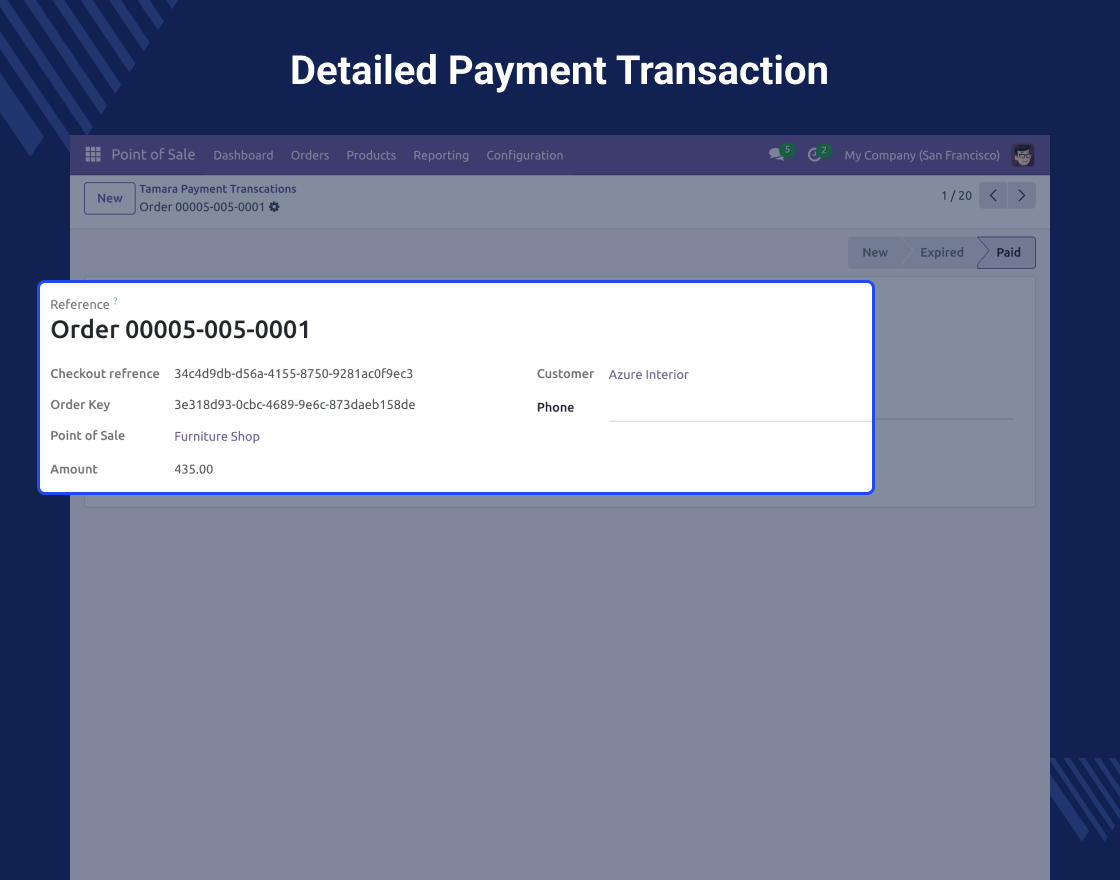 Imagine a retail store that uses Odoo POS Tamara Payment to handle customer payments. A customer wants to pay using Tamara Pay. At checkout, the customer selects Tamara Pay, enters their phone number, and receives a confirmation SMS. The payment gets processed instantly, and the users can see the transaction stored under Tamara Payment Transactions.