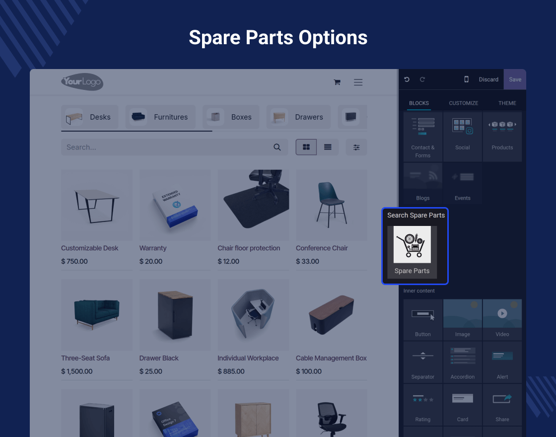 Odoo Website Spare Parts manages and showcases spare parts on Odoo website using intuitive drag-and-drop tools, customizable filters, and a straightforward setup panel.