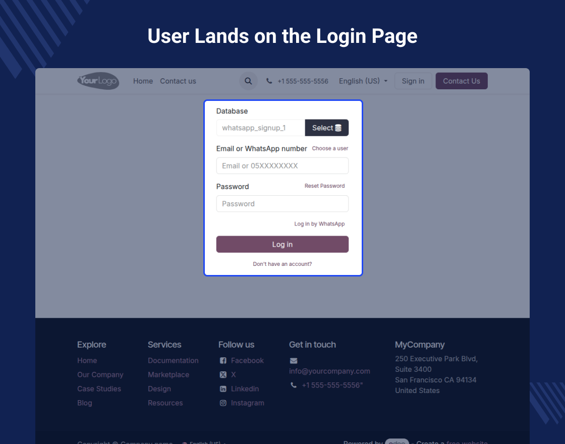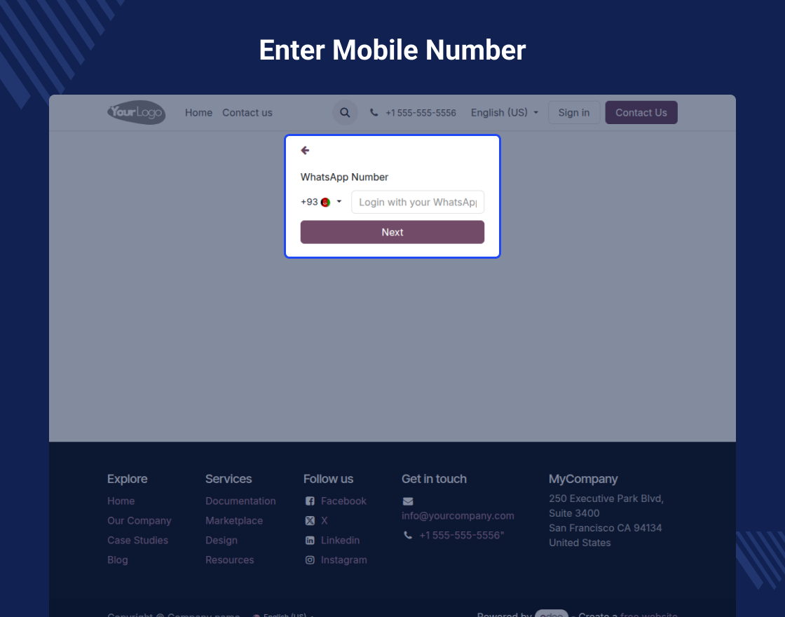 Odoo WhatsApp OTP Authentication enables users to easily sign up and log in to Odoo website using their WhatsApp number and an OTP sent instantly.