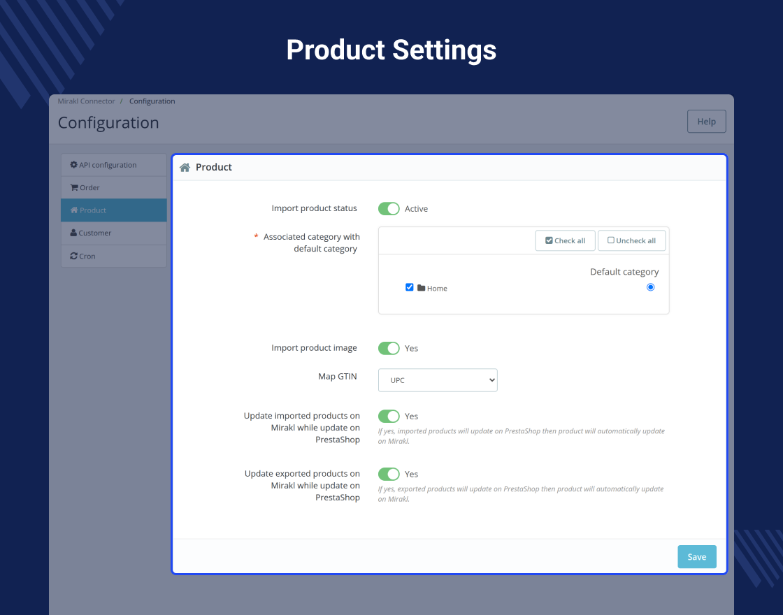 Adding products one by one manually in your PrestaShop store can be tedious and tiresome. Import all the products that you have on Mirakl to your PrestaShop store in just a single click. Also. You can set a cron job and automate the task of importing products or updating imported products on PrestaShop.