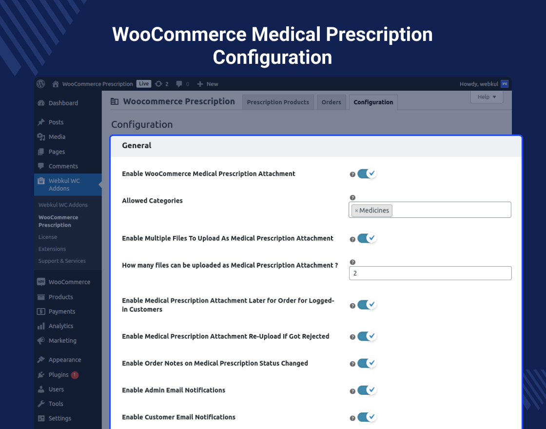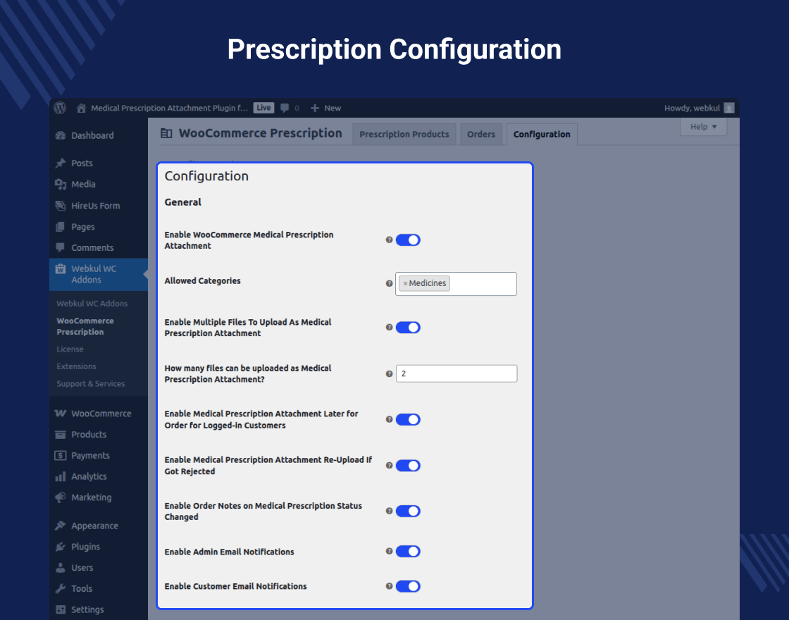 After having installed the plugin, the WooCommerce website owner can configure the settings for the label and its content that gets visible to the users within the shopping cart. Thus allowing the users to know that it’s a prescription product and there’s a need to upload a prescription document to buy the medicine. The admin can -